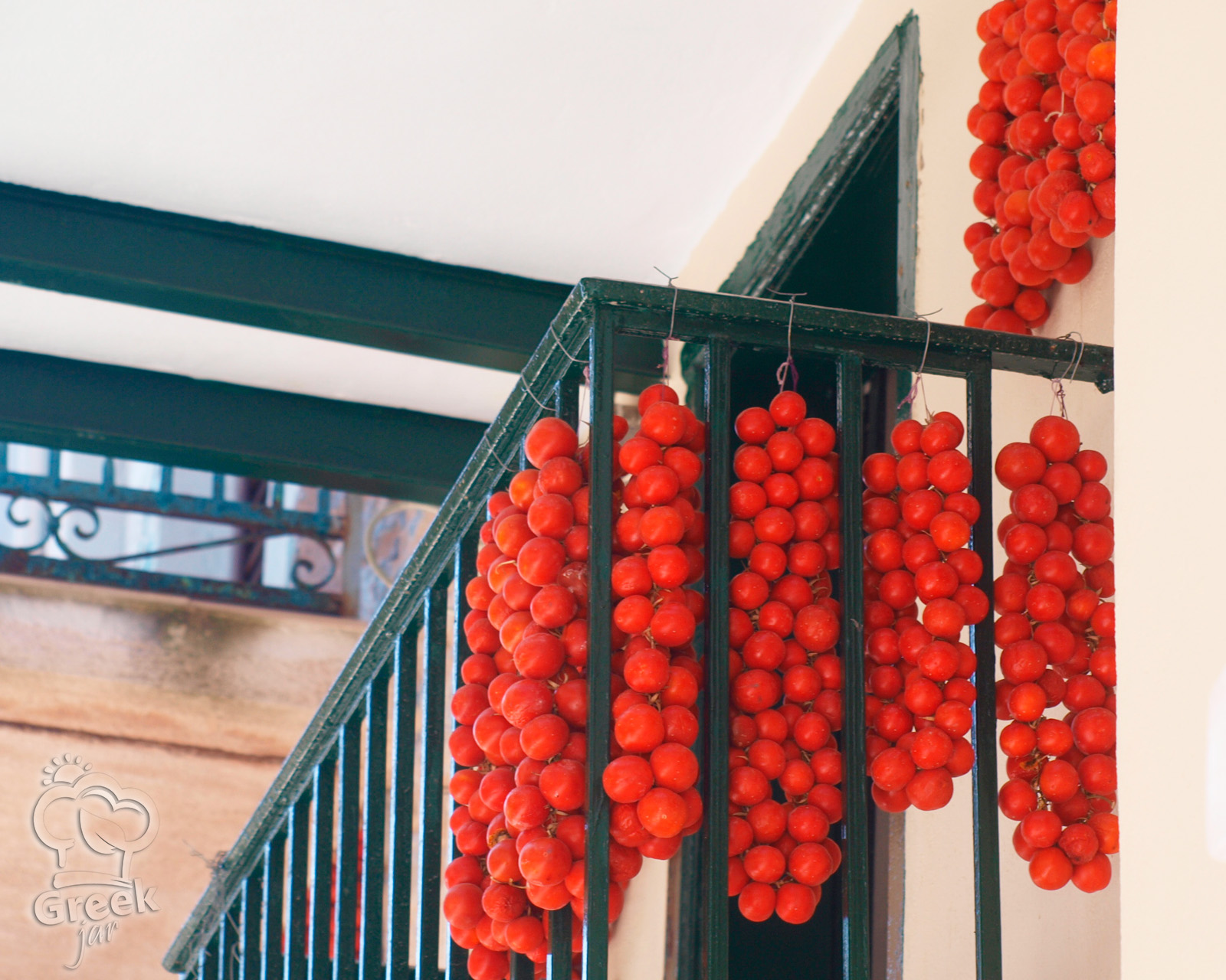 On the island of Chios, summer never fades… Tiny sun-drenched tomatoes, full of flavor, are threaded one by one with a string, forming the characteristic restes—red rows that hang like ornaments in courtyards, storerooms, and balconies.