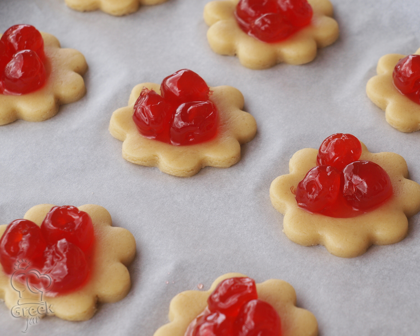 - Roll out the dough to a thickness of 0.6 - 0.7 cm and cut with a cookie cutter. Transfer to a baking tray lined with parchment paper and add 3 - 4 cherries on top of each cookie.