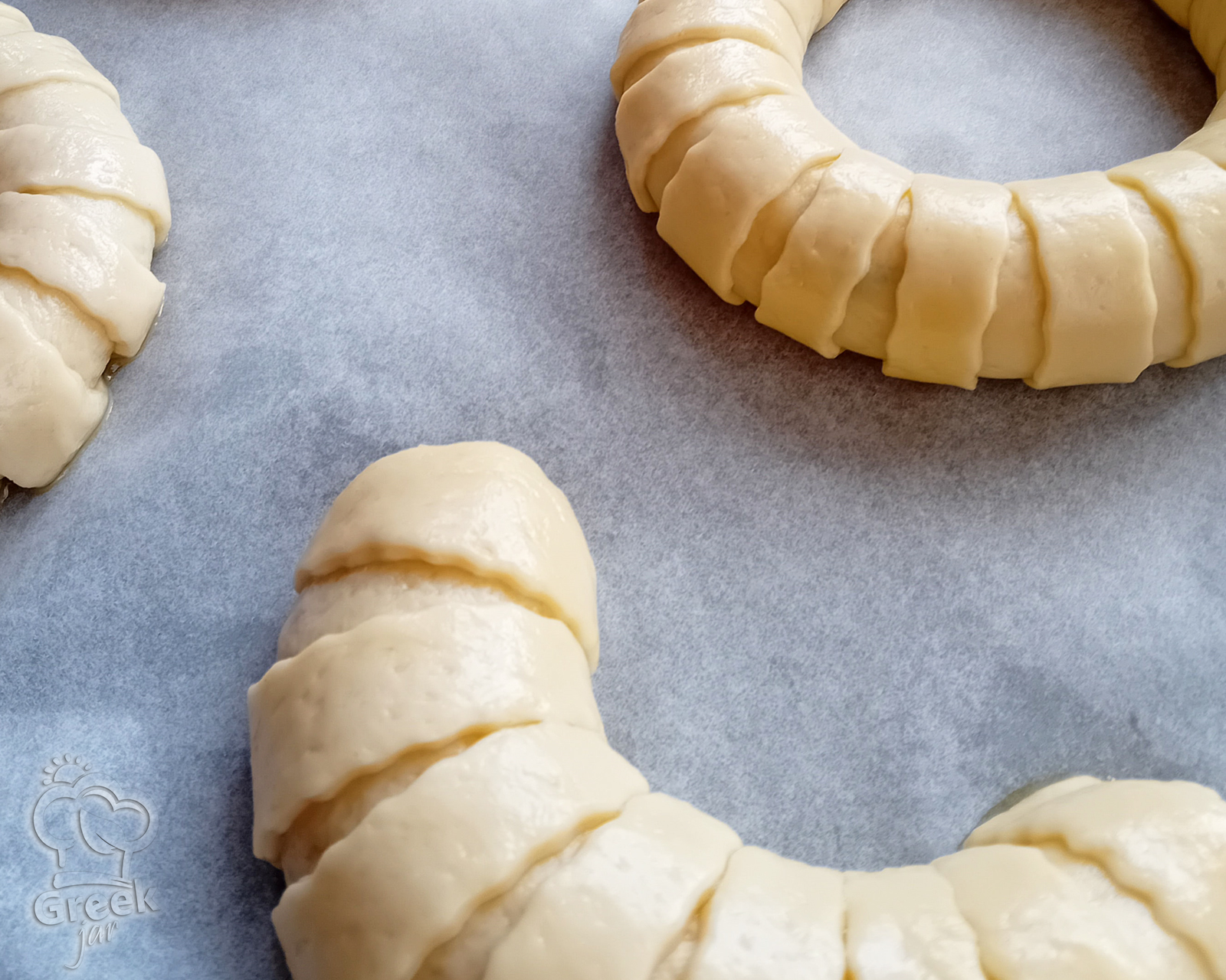 7. Μεταφέρουμε σε ταψί με λαδόκολλα και αφήνουμε να φουσκώσουν για περίπου 30΄.