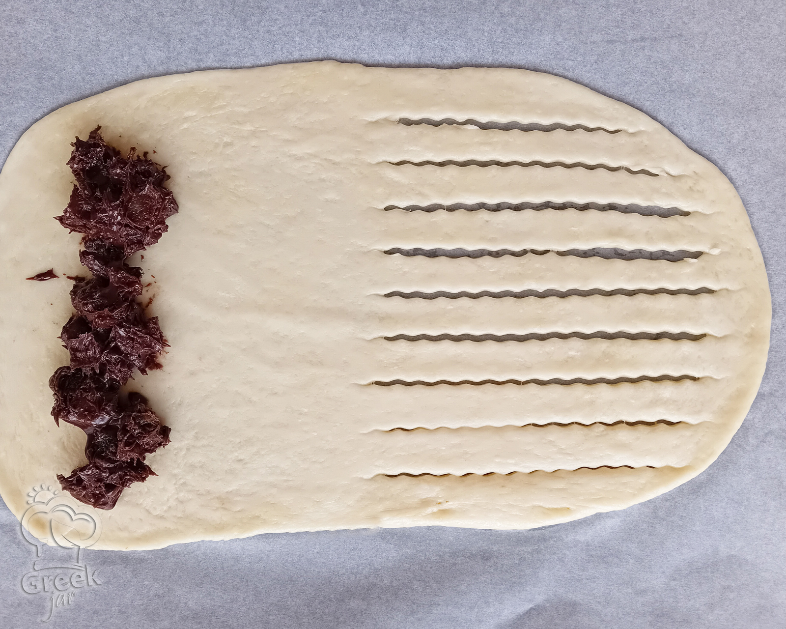 6. Προσθέτουμε γέμιση στην άλλη πλευρά, τυλίγουμε και είτε δίνουμε το σχήμα του μισοφέγγαρου για κρουασάν είτε το κλείνουμε κυκλικά για κουλούρι.
